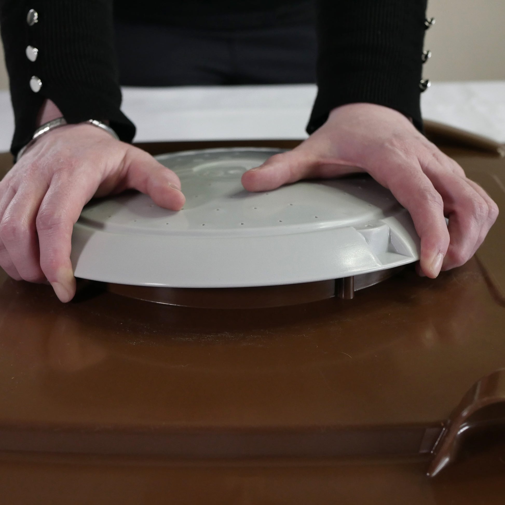 Tipp: Es ist nicht nötig, den Filter zu entfernen oder die Kappe zu öffnen. Gießen Sie einfach 1–2 Tassen Wasser auf die Rückseite des Deckels.
