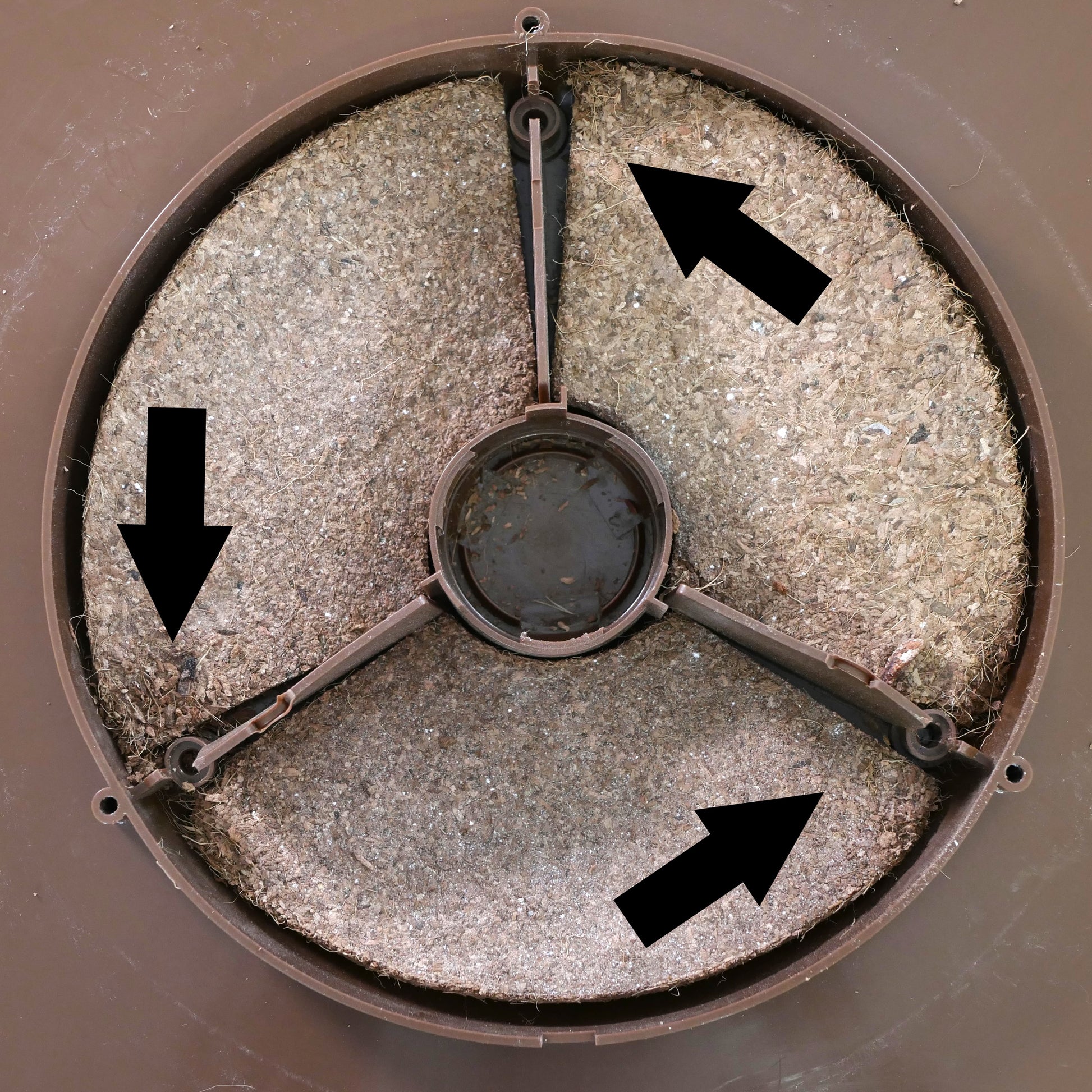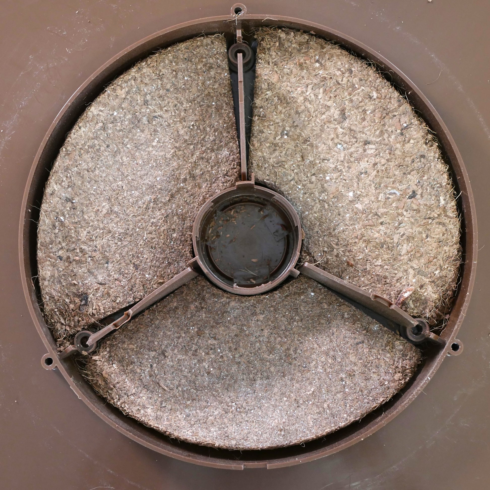 Entfernen Sie das alte Filtermaterial und entsorgen Sie es im Biomüll. Legen Sie anschließend die frischen Pads in die Filterkammer ein.