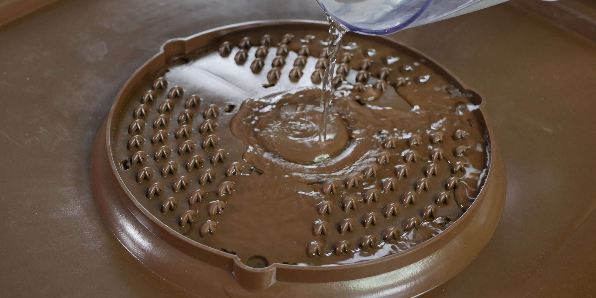 Nach dem Austausch muss der neue Filter aktiviert werden, damit die Mikroorganismen ihre Arbeit aufnehmen können. Gießen Sie dazu etwa 1 Liter lauwarmes Wasser auf die Rückseite des Deckels.