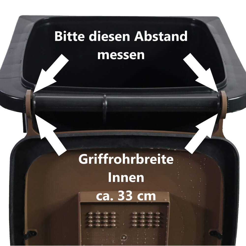 Um sicherzustellen, dass der Madendeckel perfekt auf Ihre Mülltonne passt, ist es wichtig, die richtige Größe zu bestimmen. Dabei spielt die Literzahl der Tonne keine entscheidende Rolle, sondern vielmehr die Breite des Griffrohrs.